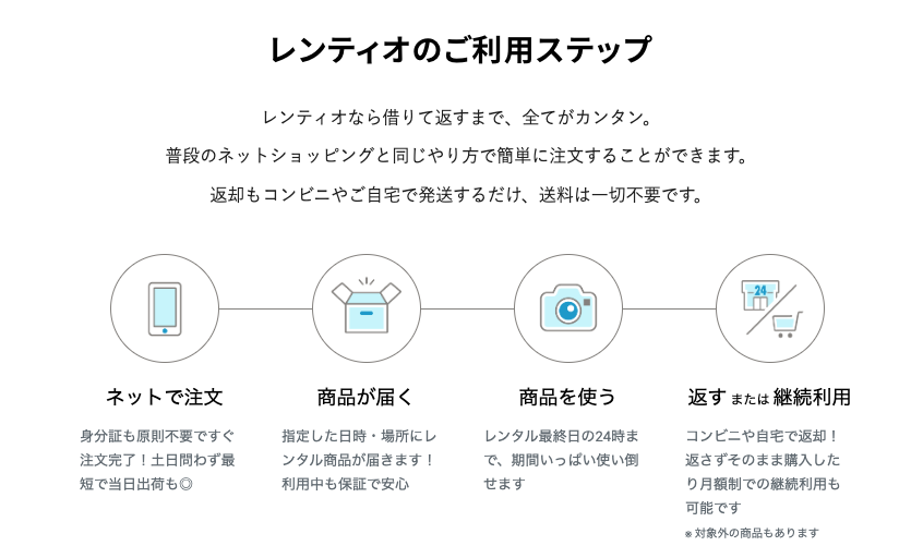 そのため、Rentio(レンティオ)を初めて利用する方も、審査の時間などなくレンタルしたい商品があればすぐにレンタルを開始できます。