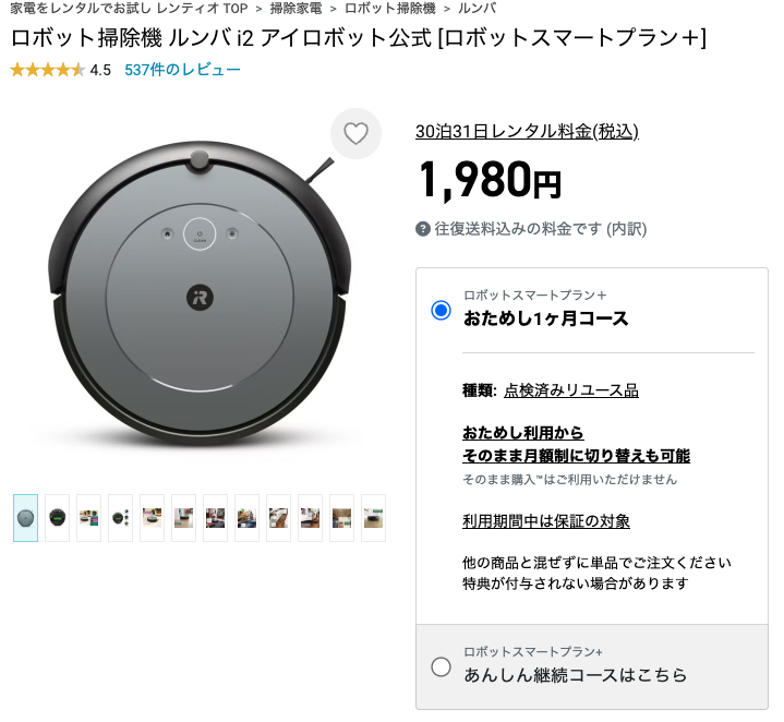 今回私はロボット掃除機 ルンバ i2のレンタルを利用してみました。