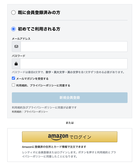 レンティオでは、メールアドレスでの会員登録のほかにAmazonアカウントを利用した会員登録の方法もありますので、Amazon会員の方はAmazonアカウントでの会員登録もおすすめです!